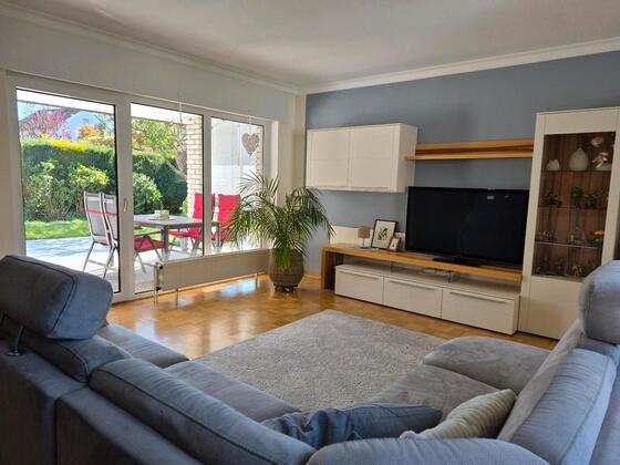 und einen schönen Garten mit überdachter Terrasse. Der großzügige Wohn- und Essbereich mit direktem